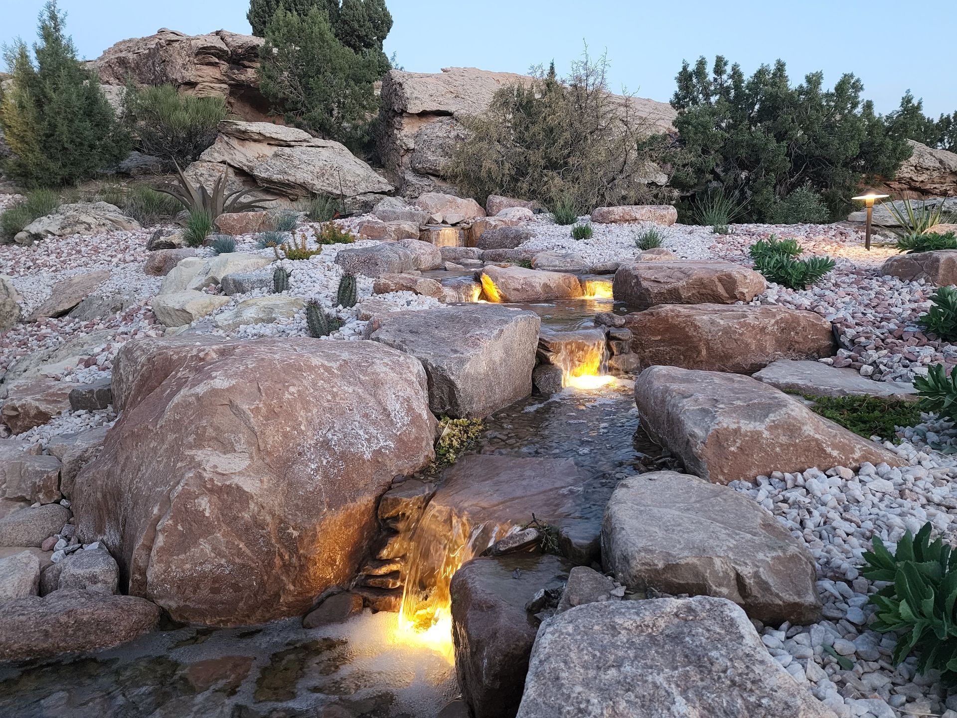 Lighting reveals waterfalls, cascades, and shoreline contours, adding depth, sparkle, and drama after dark.
